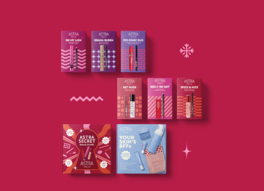 Astra Box Collection comprende tre box combo occhiOh My Lash, Drama Queen, Eye-Conic Duo; due box combo labbraGet Nude e Red-Y Or Not; la combo occhi & labbra Spice & Nice; il bundle Astra Skin Your Skin’s Bffs, composto da una routine skincare completa di cinque prodotti e un esclusivo accessorio, e Astra Secret Beauty Bundle, una confezione che racchiude cinque prodotti esclusivi a sorpresa.
