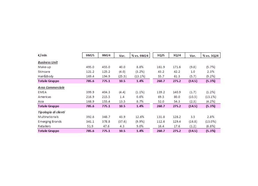 Agrate Brianza (Mb) – Intercos, azienda operante nel settore della cosmetica conto terzi, chiude i primi nove mesi del 2025 con ricavi pari a 785,6 milioni di euro, in aumento del 2,9% a tassi costanti (+1,4% a tassi correnti), nonostante un contesto geopolitico e di mercato poco favorevole. A trainare le vendite è il comparto make-up (+8,8%). Resta stabile la skincare, cala l’hair & body. Il terzo trimestre segna una flessione del 2,7% a tassi costanti, penalizzato da cambi sfavorevoli e da un minor contributo del packaging rispetto all’eccezionale 2024. L’Ebitda rettificato raggiunge 115,9 milioni (+12,3%), con una marginalità al 14,7% e un terzo trimestre in ulteriore miglioramento al 15,9%. La posizione finanziaria netta è di 133,7 milioni, in lieve aumento per effetto degli investimenti su capacità produttiva e innovazione; la leva finanziaria resta stabile a 0,86x.