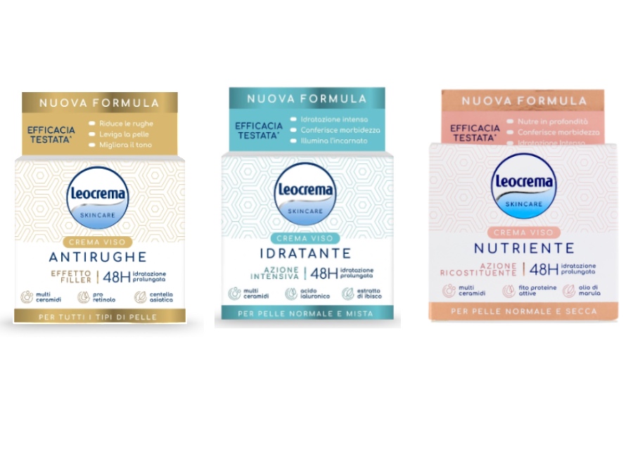 La linea comprende tre trattamenti specifici: Crema Idratante per un’idratazione prolungata per pelle normale e mista, con multi ceramidi, acido ialuronico ed estratto di ibisco; Crema Nutriente dall’azione ricostituente per pelli normali e secche, ideale anche come crema notte, con multi ceramidi, fito proteine attive e olio di marula; Crema Antirughe dall’effetto filler per tutti i tipi di pelle, con multi ceramidi, pro retinolo e centella asiatica, utile a ridurre rughe e linee sottili. Usate quotidianamente, le creme Leocrema aiutano a migliorare visibilmente l’aspetto della pelle, lasciandola morbida, protetta e luminosa.
